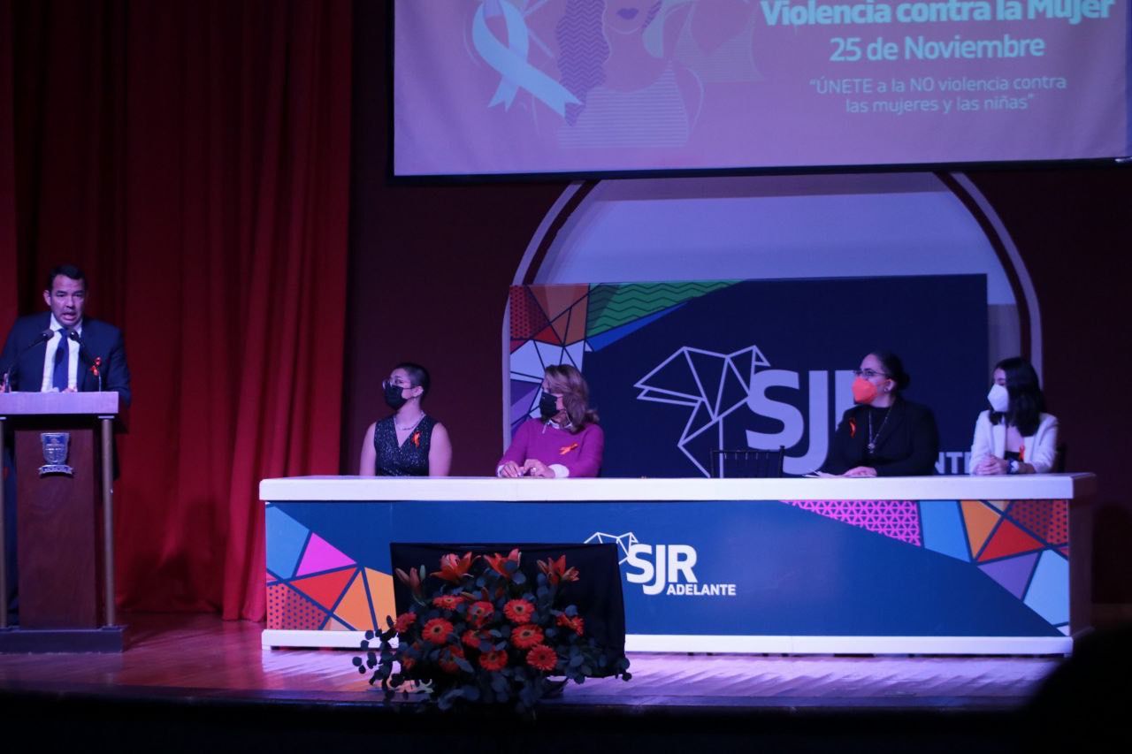 Cómo parte de las actividades con motivo del Día Internacional de la Eliminación de la Violencia Contra la Mujer, el presidente municipal de San Juan del Río, Roberto Cabrera Valencia, asistió al encuentro organizado por el Instituto Municipal de la Mujer para conmemorar, visibilizar y generar conciencia de esta problemática.