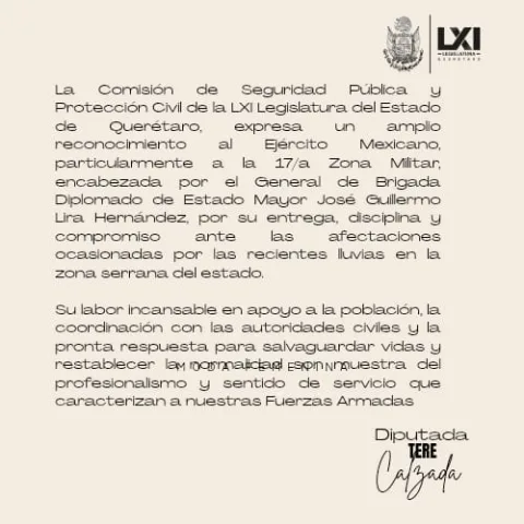 La Comisión de Seguridad Pública y Protección Civil de la LXI Legislatura del Estado de Querétaro, expresa un amplio reconocimiento al Ejército Mexicano, particularmente a la 17/a Zona Militar, encabezada por el General de Brigada Diplomado de Estado Mayor José Guillermo Lira Hernández, por su entrega, disciplina y compromiso ante las afectaciones ocasionadas por las recientes lluvias en la zona serrana del estado.