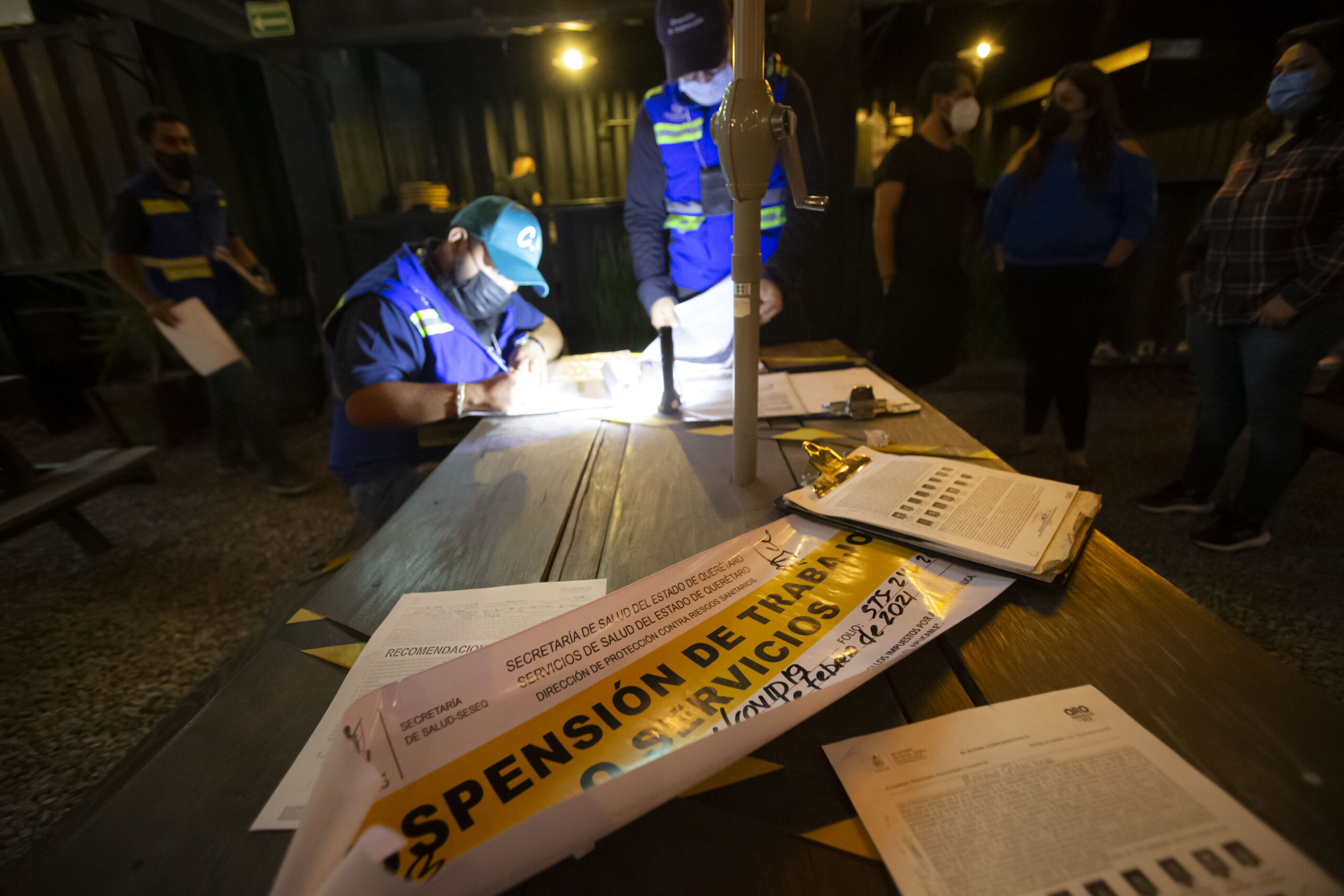 Fueron suspendidos en el municipio de Querétaro una plaza con venta de alimentos y una marisquería, en San Juan del Río dos restaurantes-bar, en El Marqués un salón de fiestas y en Corregidora un restaurante-bar, por incumplir con protocolos de prevención para la enfermedad COVID-19, por no contar con aviso de funcionamiento, no guardar sana distancia entre personas (de 1.5 a dos metros), por tener aforo mayor a lo estipulado y por laborar fuera de horario.