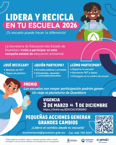 La Secretaría de Educación del Estado de Querétaro (SEDEQ) anuncia la puesta en marcha de la campaña “Lidera y recicla en tu Escuela 2026”, que tiene como objetivo promover la cultura de reciclaje, el consumo responsable y el cuidado del medio ambiente mediante la participación activa de las comunidades escolares.