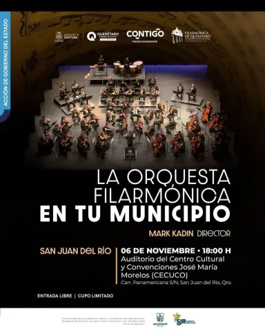 Como parte de una iniciativa conjunta entre la Orquesta Filarmónica del Estado de Querétaro (OFEQ) y la Secretaría de Cultura estatal (SECULT), a través de la cual se busca llevar la música clásica a todos los rincones del estado, acercando el arte, la cultura y el talento a más comunidades, este jueves 6 de noviembre a las 18 horas, el auditorio del Centro Cultural y de Convenciones (CECUCO) de San Juan del Río recibirá a la OFEQ, que ofrecerá un concierto gratuito.