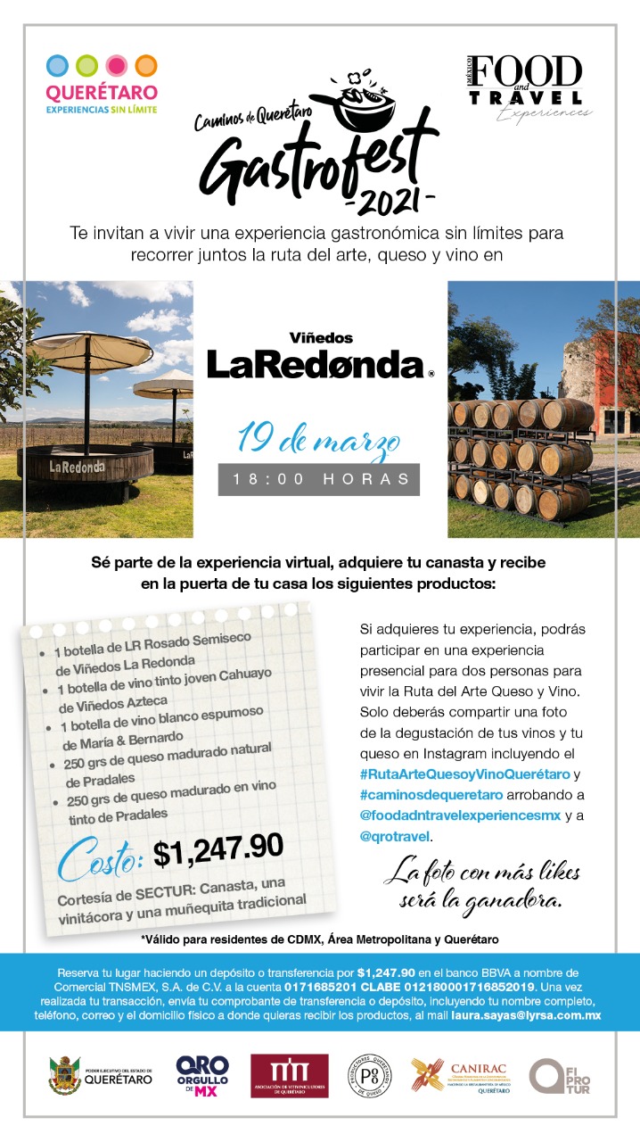 Adicionalmente, Viñedos La Redonda estará ofreciendo un evento gastronómico presencial con cupo limitado, que se llevará a cabo el mismo 19 de marzo a partir de las 2 de la tarde. Reservaciones al teléfono 5580758373.